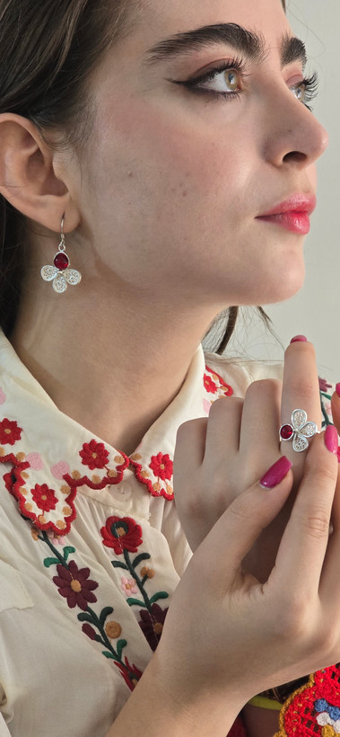 نیم ست نقره ای رز سرخ تماما دستساز با نقره 999 و سنگ لعل قرمز بسیار با کیفیت ساخته شده